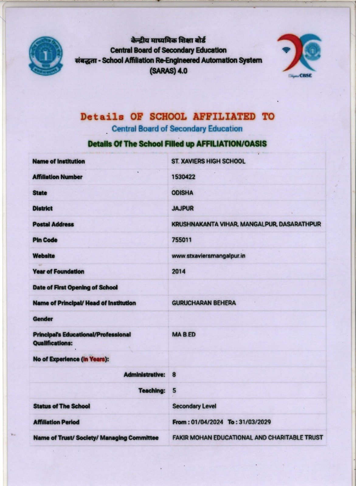 | 4 | COMPLETE ADDRESS WITH PIN CODE | ST. XAVIERS HIGH SCHOOL, KRUSHNAKANTA VIHAR, MANGALPUR, DASRATHPUR, JAJPUR - 755011, ODISHA |